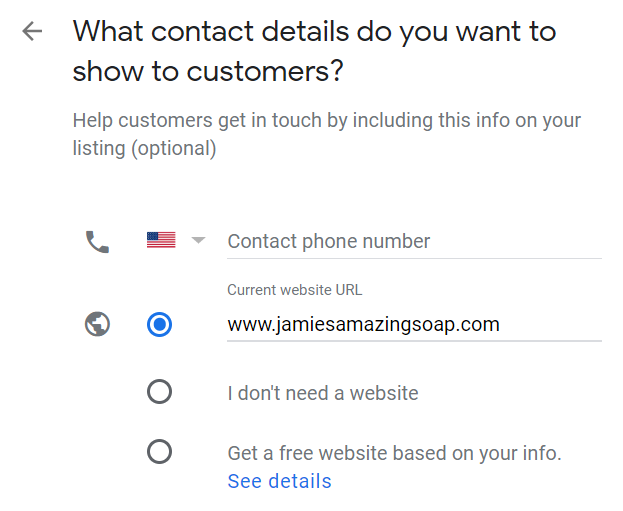 h) Add a contact phone number and website URL Neither is compulsory but is strongly recommended if you want to take advantage of GMB functionalities like call tracking. If you ever need to change this when updating your Google business listing, be sure to make those changes to all other business listings, too.